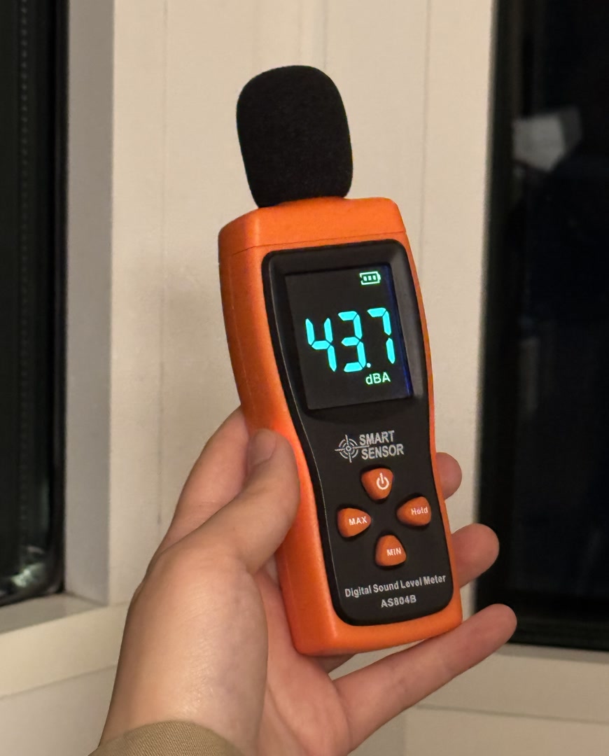 晚上8点多记者在居民家测量关窗状态下的噪声。